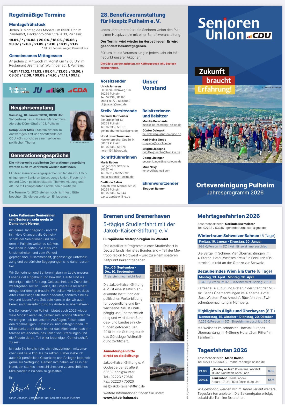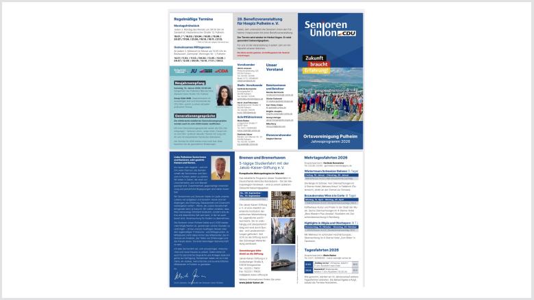 13.12.2025 Jahresprogramm 2026 Das Jahresprogramm 2026 von der Seniorenunion Ortsvereinigung Pulheim DateiDownload (2 MB) Empfehlen Sie uns!Bei Facebook teilen Bei Twitter (X) teilen Bei Whatsapp teilen Diese Seite drucken Diese Seite einem Freund schicken